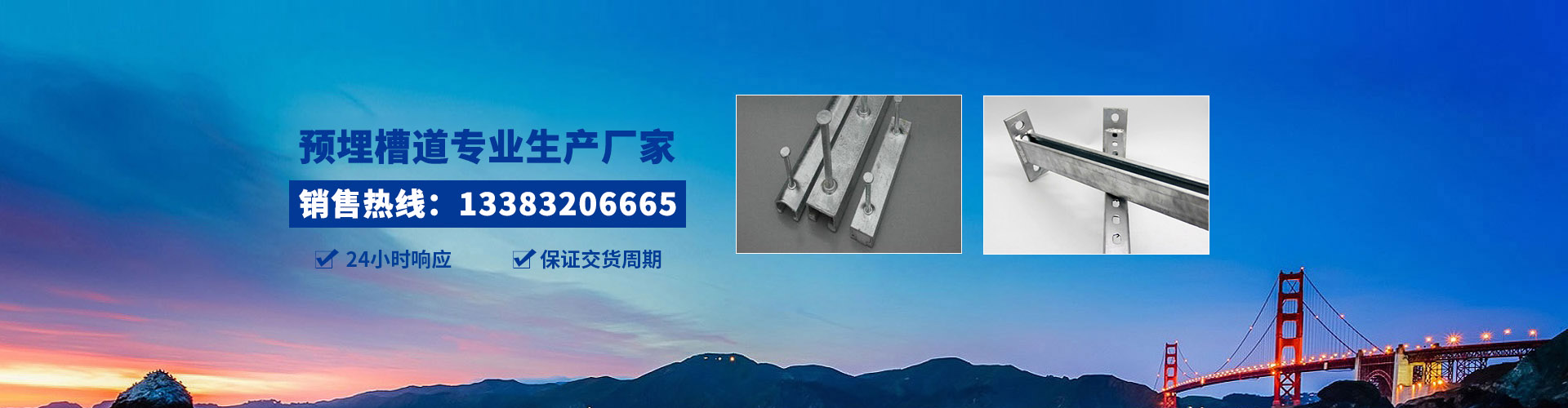 我厂主要产品有:预埋槽道、槽式预埋件、带齿预埋槽道、弧形预埋槽道、隧道预埋槽道、高铁吊兰预埋槽道、C型钢槽道、T型螺栓、管廊支架,订做各种预埋件。材料采用正规大厂材质,有Q235B,35#钢,45#钢,40Cr、35CrmoA、Q345B材质,产品经过严格检验,保证产品质量。